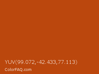 YUV 99.072,-42.433,77.113 Color is a normal orange color and the nearest color is Rock Spray #ba450c. Hex code #bb470d and RGB value is rgb(187,71,13). In RGB color space, this color is composed of 73% red, 28% green, 5% blue, In CMYK color space, this color is composed of 0% cyan, 62% magenta, 93% yellow , 27% black , In HSL color space, this color has a hue angle of 20° , 87% saturation and 39% lightness.