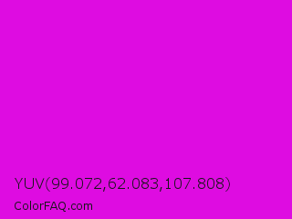 YUV 99.072,62.083,107.808 Color is a normal magenta color and the nearest color is Deep Magenta #cc00cc. Hex code #de0ce1 and RGB value is rgb(222,12,225). In RGB color space, this color is composed of 87% red, 5% green, 88% blue, In CMYK color space, this color is composed of 1% cyan, 95% magenta, 0% yellow , 12% black , In HSL color space, this color has a hue angle of 299° , 90% saturation and 46% lightness.