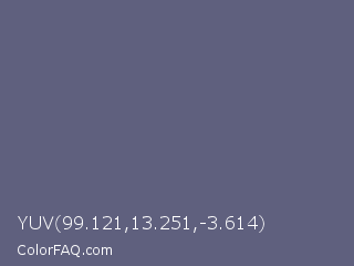 YUV 99.121,13.251,-3.614 Color is a normal blue color and the nearest color is Dolphin #646077. Hex code #5f607e and RGB value is rgb(95,96,126). In RGB color space, this color is composed of 37% red, 38% green, 49% blue, In CMYK color space, this color is composed of 25% cyan, 24% magenta, 0% yellow , 51% black , In HSL color space, this color has a hue angle of 238° , 14% saturation and 43% lightness.