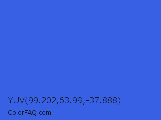 YUV 99.202,63.99,-37.888 Color is a normal blue color and the nearest color is Royal Blue #4169e1. Hex code #3860e5 and RGB value is rgb(56,96,229). In RGB color space, this color is composed of 22% red, 38% green, 90% blue, In CMYK color space, this color is composed of 76% cyan, 58% magenta, 0% yellow , 10% black , In HSL color space, this color has a hue angle of 226° , 77% saturation and 56% lightness.