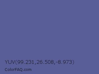 YUV 99.231,26.508,-8.973 Color is a normal blue color and the nearest color is UCLA Blue #536895. Hex code #595e99 and RGB value is rgb(89,94,153). In RGB color space, this color is composed of 35% red, 37% green, 60% blue, In CMYK color space, this color is composed of 42% cyan, 39% magenta, 0% yellow , 40% black , In HSL color space, this color has a hue angle of 235° , 26% saturation and 47% lightness.