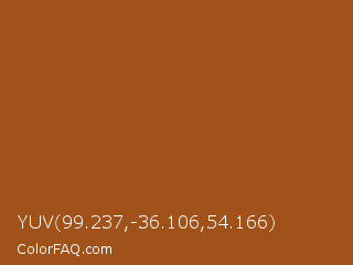 YUV 99.237,-36.106,54.166 Color is a normal orange color and the nearest color is Hawaiian Tan #9d5616. Hex code #a1521a and RGB value is rgb(161,82,26). In RGB color space, this color is composed of 63% red, 32% green, 10% blue, In CMYK color space, this color is composed of 0% cyan, 49% magenta, 84% yellow , 37% black , In HSL color space, this color has a hue angle of 25° , 72% saturation and 37% lightness.