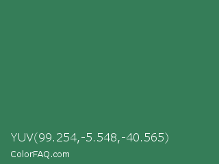 YUV 99.254,-5.548,-40.565 Color is a normal green color and the nearest color is Amazon #3b7a57. Hex code #357d58 and RGB value is rgb(53,125,88). In RGB color space, this color is composed of 21% red, 49% green, 35% blue, In CMYK color space, this color is composed of 58% cyan, 0% magenta, 30% yellow , 51% black , In HSL color space, this color has a hue angle of 149° , 40% saturation and 35% lightness.
