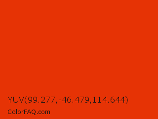 YUV 99.277,-46.479,114.644 Color is a normal red color and the nearest color is Grenadier #d54600. Hex code #e63305 and RGB value is rgb(230,51,5). In RGB color space, this color is composed of 90% red, 20% green, 2% blue, In CMYK color space, this color is composed of 0% cyan, 78% magenta, 98% yellow , 10% black , In HSL color space, this color has a hue angle of 12° , 96% saturation and 46% lightness.