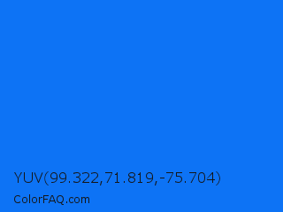 YUV 99.322,71.819,-75.704 Color is a normal blue color and the nearest color is Brandeis Blue #0070ff. Hex code #0d73f5 and RGB value is rgb(13,115,245). In RGB color space, this color is composed of 5% red, 45% green, 96% blue, In CMYK color space, this color is composed of 95% cyan, 53% magenta, 0% yellow , 4% black , In HSL color space, this color has a hue angle of 214° , 92% saturation and 51% lightness.
