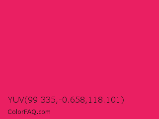 YUV 99.335,-0.658,118.101 Color is a normal rose color and the nearest color is Razzmatazz #e3256b. Hex code #ea1f62 and RGB value is rgb(234,31,98). In RGB color space, this color is composed of 92% red, 12% green, 38% blue, In CMYK color space, this color is composed of 0% cyan, 87% magenta, 58% yellow , 8% black , In HSL color space, this color has a hue angle of 340° , 83% saturation and 52% lightness.