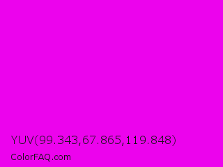 YUV 99.343,67.865,119.848 Color is a normal magenta color and the nearest color is Phlox #df00ff. Hex code #ec03ed and RGB value is rgb(236,3,237). In RGB color space, this color is composed of 93% red, 1% green, 93% blue, In CMYK color space, this color is composed of 0% cyan, 99% magenta, 0% yellow , 7% black , In HSL color space, this color has a hue angle of 300° , 98% saturation and 47% lightness.