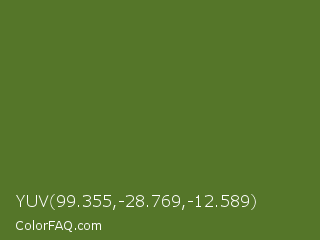 YUV 99.355,-28.769,-12.589 Color is a normal green color and the nearest color is Sap Green #507d2a. Hex code #557629 and RGB value is rgb(85,118,41). In RGB color space, this color is composed of 33% red, 46% green, 16% blue, In CMYK color space, this color is composed of 28% cyan, 0% magenta, 65% yellow , 54% black , In HSL color space, this color has a hue angle of 86° , 48% saturation and 31% lightness.