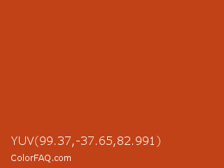 YUV 99.37,-37.65,82.991 Color is a normal color and the nearest color is Tia Maria #c1440e. Hex code #c24217 and RGB value is rgb(194,66,23). In RGB color space, this color is composed of 76% red, 26% green, 9% blue, In CMYK color space, this color is composed of 0% cyan, 66% magenta, 88% yellow , 24% black , In HSL color space, this color has a hue angle of 15° , 79% saturation and 43% lightness.