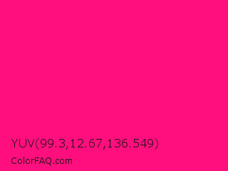 YUV 99.3,12.67,136.549 Color is a normal rose color and the nearest color is Winter Sky #ff007c. Hex code #ff0f7d and RGB value is rgb(255,15,125). In RGB color space, this color is composed of 100% red, 6% green, 49% blue, In CMYK color space, this color is composed of 0% cyan, 94% magenta, 51% yellow , 0% black , In HSL color space, this color has a hue angle of 333° , 100% saturation and 53% lightness.