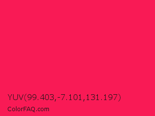 YUV 99.403,-7.101,131.197 Color is a normal rose color and the nearest color is Awesome #ff2052. Hex code #f91a55 and RGB value is rgb(249,26,85). In RGB color space, this color is composed of 98% red, 10% green, 33% blue, In CMYK color space, this color is composed of 0% cyan, 90% magenta, 66% yellow , 2% black , In HSL color space, this color has a hue angle of 344° , 95% saturation and 54% lightness.