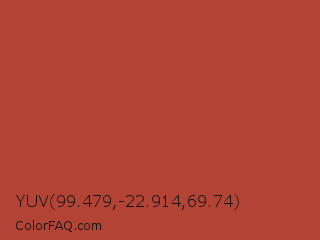 YUV 99.479,-22.914,69.74 Color is a normal red color and the nearest color is Medium Carmine #af4035. Hex code #b34435 and RGB value is rgb(179,68,53). In RGB color space, this color is composed of 70% red, 27% green, 21% blue, In CMYK color space, this color is composed of 0% cyan, 62% magenta, 70% yellow , 30% black , In HSL color space, this color has a hue angle of 7° , 54% saturation and 45% lightness.