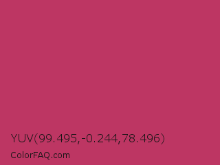 YUV 99.495,-0.244,78.496 Color is a normal rose color and the nearest color is Hibiscus #b6316c. Hex code #bd3663 and RGB value is rgb(189,54,99). In RGB color space, this color is composed of 74% red, 21% green, 39% blue, In CMYK color space, this color is composed of 0% cyan, 71% magenta, 48% yellow , 26% black , In HSL color space, this color has a hue angle of 340° , 56% saturation and 48% lightness.