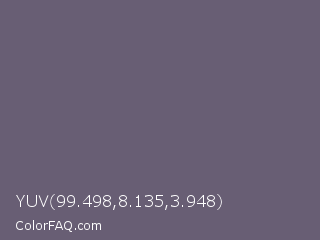 YUV 99.498,8.135,3.948 Color is a normal violet color and the nearest color is Dolphin #646077. Hex code #685e74 and RGB value is rgb(104,94,116). In RGB color space, this color is composed of 41% red, 37% green, 45% blue, In CMYK color space, this color is composed of 10% cyan, 19% magenta, 0% yellow , 55% black , In HSL color space, this color has a hue angle of 267° , 10% saturation and 41% lightness.