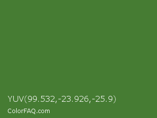 YUV 99.532,-23.926,-25.9 Color is a normal green color and the nearest color is Sap Green #507d2a. Hex code #467c33 and RGB value is rgb(70,124,51). In RGB color space, this color is composed of 27% red, 49% green, 20% blue, In CMYK color space, this color is composed of 44% cyan, 0% magenta, 59% yellow , 51% black , In HSL color space, this color has a hue angle of 104° , 42% saturation and 34% lightness.