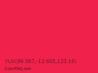 YUV 99.567,-12.605,123.16 Color is a normal red color and the nearest color is Red Crayola #ee204d. Hex code #f0214a and RGB value is rgb(240,33,74). In RGB color space, this color is composed of 94% red, 13% green, 29% blue, In CMYK color space, this color is composed of 0% cyan, 86% magenta, 69% yellow , 6% black , In HSL color space, this color has a hue angle of 348° , 87% saturation and 54% lightness.