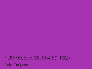 YUV 99.575,38.664,59.132 Color is a normal magenta color and the nearest color is Byzantine #bd33a4. Hex code #a732b2 and RGB value is rgb(167,50,178). In RGB color space, this color is composed of 65% red, 20% green, 70% blue, In CMYK color space, this color is composed of 6% cyan, 72% magenta, 0% yellow , 30% black , In HSL color space, this color has a hue angle of 295° , 56% saturation and 45% lightness.