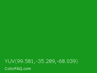 YUV 99.581,-35.289,-68.039 Color is a normal green color and the nearest color is Forest Green #228b22. Hex code #16991c and RGB value is rgb(22,153,28). In RGB color space, this color is composed of 9% red, 60% green, 11% blue, In CMYK color space, this color is composed of 86% cyan, 0% magenta, 82% yellow , 40% black , In HSL color space, this color has a hue angle of 123° , 75% saturation and 34% lightness.