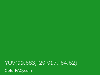 YUV 99.683,-29.917,-64.62 Color is a normal green color and the nearest color is Forest Green #228b22. Hex code #1a9527 and RGB value is rgb(26,149,39). In RGB color space, this color is composed of 10% red, 58% green, 15% blue, In CMYK color space, this color is composed of 83% cyan, 0% magenta, 74% yellow , 42% black , In HSL color space, this color has a hue angle of 126° , 70% saturation and 34% lightness.