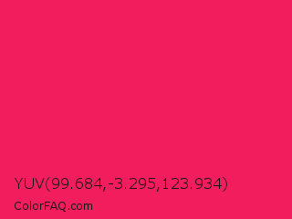 YUV 99.684,-3.295,123.934 Color is a normal rose color and the nearest color is Red Crayola #ee204d. Hex code #f11d5d and RGB value is rgb(241,29,93). In RGB color space, this color is composed of 95% red, 11% green, 36% blue, In CMYK color space, this color is composed of 0% cyan, 88% magenta, 61% yellow , 5% black , In HSL color space, this color has a hue angle of 342° , 88% saturation and 53% lightness.