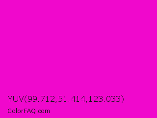 YUV 99.712,51.414,123.033 Color is a normal magenta color and the nearest color is Purple Pizzazz #ff00cc. Hex code #f008cc and RGB value is rgb(240,8,204). In RGB color space, this color is composed of 94% red, 3% green, 80% blue, In CMYK color space, this color is composed of 0% cyan, 97% magenta, 15% yellow , 6% black , In HSL color space, this color has a hue angle of 309° , 94% saturation and 49% lightness.