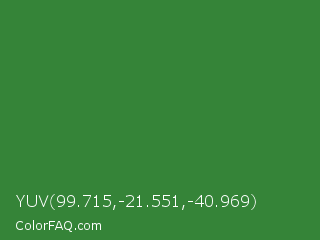 YUV 99.715,-21.551,-40.969 Color is a normal green color and the nearest color is May Green #4c9141. Hex code #358438 and RGB value is rgb(53,132,56). In RGB color space, this color is composed of 21% red, 52% green, 22% blue, In CMYK color space, this color is composed of 60% cyan, 0% magenta, 58% yellow , 48% black , In HSL color space, this color has a hue angle of 122° , 43% saturation and 36% lightness.