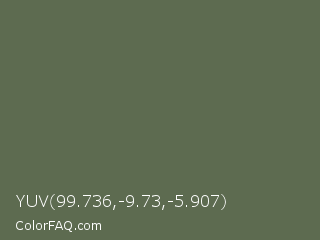 YUV 99.736,-9.73,-5.907 Color is a normal green color and the nearest color is Siam #646a54. Hex code #5d6b50 and RGB value is rgb(93,107,80). In RGB color space, this color is composed of 36% red, 42% green, 31% blue, In CMYK color space, this color is composed of 13% cyan, 0% magenta, 25% yellow , 58% black , In HSL color space, this color has a hue angle of 91° , 14% saturation and 37% lightness.