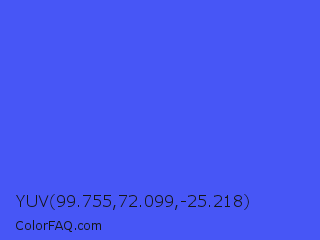YUV 99.755,72.099,-25.218 Color is a light blue color and the nearest color is Ultramarine Blue #4166f5. Hex code #4756f6 and RGB value is rgb(71,86,246). In RGB color space, this color is composed of 28% red, 34% green, 96% blue, In CMYK color space, this color is composed of 71% cyan, 65% magenta, 0% yellow , 4% black , In HSL color space, this color has a hue angle of 235° , 91% saturation and 62% lightness.