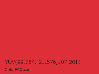 YUV 99.764,-21.576,107.201 Color is a normal red color and the nearest color is Alizarin Crimson #e32636. Hex code #de2e38 and RGB value is rgb(222,46,56). In RGB color space, this color is composed of 87% red, 18% green, 22% blue, In CMYK color space, this color is composed of 0% cyan, 79% magenta, 75% yellow , 13% black , In HSL color space, this color has a hue angle of 357° , 73% saturation and 53% lightness.