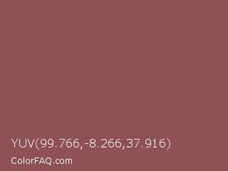 YUV 99.766,-8.266,37.916 Color is a normal red color and the nearest color is Rose Taupe #905d5d. Hex code #8f5153 and RGB value is rgb(143,81,83). In RGB color space, this color is composed of 56% red, 32% green, 33% blue, In CMYK color space, this color is composed of 0% cyan, 43% magenta, 42% yellow , 44% black , In HSL color space, this color has a hue angle of 358° , 28% saturation and 44% lightness.