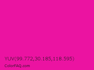 YUV 99.772,30.185,118.595 Color is a normal magenta color and the nearest color is Hollywood Cerise #f400a1. Hex code #eb13a1 and RGB value is rgb(235,19,161). In RGB color space, this color is composed of 92% red, 7% green, 63% blue, In CMYK color space, this color is composed of 0% cyan, 92% magenta, 31% yellow , 8% black , In HSL color space, this color has a hue angle of 321° , 85% saturation and 50% lightness.