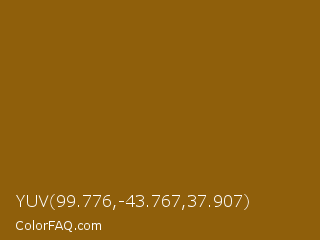 YUV 99.776,-43.767,37.907 Color is a dark orange color and the nearest color is Corn Harvest #8b6b0b. Hex code #8f5f0b and RGB value is rgb(143,95,11). In RGB color space, this color is composed of 56% red, 37% green, 4% blue, In CMYK color space, this color is composed of 0% cyan, 34% magenta, 92% yellow , 44% black , In HSL color space, this color has a hue angle of 38° , 86% saturation and 30% lightness.