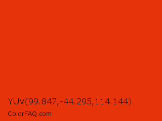 YUV 99.847,-44.295,114.144 Color is a normal red color and the nearest color is Vermilion #d9381e. Hex code #e6330a and RGB value is rgb(230,51,10). In RGB color space, this color is composed of 90% red, 20% green, 4% blue, In CMYK color space, this color is composed of 0% cyan, 78% magenta, 96% yellow , 10% black , In HSL color space, this color has a hue angle of 11° , 92% saturation and 47% lightness.