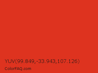 YUV 99.849,-33.943,107.126 Color is a normal red color and the nearest color is Vermilion #d9381e. Hex code #de331f and RGB value is rgb(222,51,31). In RGB color space, this color is composed of 87% red, 20% green, 12% blue, In CMYK color space, this color is composed of 0% cyan, 77% magenta, 86% yellow , 13% black , In HSL color space, this color has a hue angle of 6° , 75% saturation and 50% lightness.