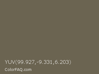 YUV 99.927,-9.331,6.203 Color is a normal orange color and the nearest color is Soya Bean #6a6051. Hex code #6b6451 and RGB value is rgb(107,100,81). In RGB color space, this color is composed of 42% red, 39% green, 32% blue, In CMYK color space, this color is composed of 0% cyan, 7% magenta, 24% yellow , 58% black , In HSL color space, this color has a hue angle of 44° , 14% saturation and 37% lightness.