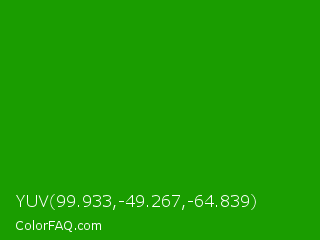 YUV 99.933,-49.267,-64.839 Color is a normal green color and the nearest color is India Green #138808. Hex code #1a9d00 and RGB value is rgb(26,157,-0). In RGB color space, this color is composed of 10% red, 62% green, 0% blue, In CMYK color space, this color is composed of 83% cyan, 0% magenta, 100% yellow , 38% black , In HSL color space, this color has a hue angle of 110° , 100% saturation and 31% lightness.