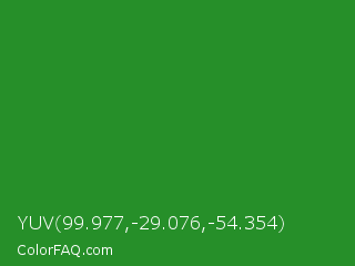 YUV 99.977,-29.076,-54.354 Color is a normal green color and the nearest color is Forest Green #228b22. Hex code #268f29 and RGB value is rgb(38,143,41). In RGB color space, this color is composed of 15% red, 56% green, 16% blue, In CMYK color space, this color is composed of 73% cyan, 0% magenta, 71% yellow , 44% black , In HSL color space, this color has a hue angle of 122° , 58% saturation and 35% lightness.