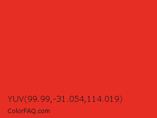 YUV 99.99,-31.054,114.019 Color is a normal red color and the nearest color is Permanent Geranium Lake #e12c2c. Hex code #e62e25 and RGB value is rgb(230,46,37). In RGB color space, this color is composed of 90% red, 18% green, 15% blue, In CMYK color space, this color is composed of 0% cyan, 80% magenta, 84% yellow , 10% black , In HSL color space, this color has a hue angle of 3° , 79% saturation and 52% lightness.