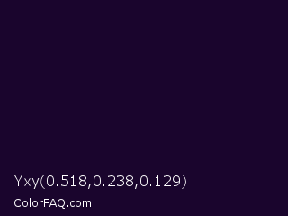 Yxy 0.518,0.238,0.129 Color is a very dark purple color and the nearest color is Haiti #1b1035. Hex code #1a052d and RGB value is rgb(26,5,45). In RGB color space, this color is composed of 10% red, 2% green, 18% blue, In CMYK color space, this color is composed of 42% cyan, 89% magenta, 0% yellow , 82% black , In HSL color space, this color has a hue angle of 272° , 80% saturation and 10% lightness.