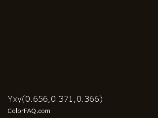Yxy 0.656,0.371,0.366 Color is a almost black orange color and the nearest color is Licorice #1a1110. Hex code #18120d and RGB value is rgb(24,18,13). In RGB color space, this color is composed of 9% red, 7% green, 5% blue, In CMYK color space, this color is composed of 0% cyan, 25% magenta, 46% yellow , 91% black , In HSL color space, this color has a hue angle of 27° , 30% saturation and 7% lightness.