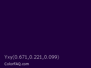 Yxy 0.671,0.221,0.099 Color is a very dark purple color and the nearest color is Tolopea #1b0245. Hex code #21003e and RGB value is rgb(33,0,62). In RGB color space, this color is composed of 13% red, 0% green, 24% blue, In CMYK color space, this color is composed of 47% cyan, 100% magenta, 0% yellow , 76% black , In HSL color space, this color has a hue angle of 272° , 100% saturation and 12% lightness.