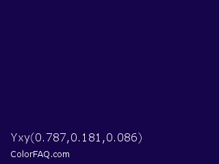 Yxy 0.787,0.181,0.086 Color is a very dark indigo color and the nearest color is Tolopea #1b0245. Hex code #16054b and RGB value is rgb(22,5,75). In RGB color space, this color is composed of 9% red, 2% green, 29% blue, In CMYK color space, this color is composed of 71% cyan, 93% magenta, 0% yellow , 71% black , In HSL color space, this color has a hue angle of 255° , 88% saturation and 16% lightness.