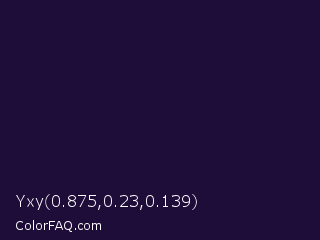 Yxy 0.875,0.23,0.139 Color is a very dark violet color and the nearest color is Haiti #1b1035. Hex code #1f0d39 and RGB value is rgb(31,13,57). In RGB color space, this color is composed of 12% red, 5% green, 22% blue, In CMYK color space, this color is composed of 46% cyan, 77% magenta, 0% yellow , 78% black , In HSL color space, this color has a hue angle of 265° , 63% saturation and 14% lightness.