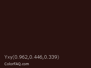 Yxy 0.962,0.446,0.339 Color is a very dark red color and the nearest color is Coffee Bean #2a140e. Hex code #2a1210 and RGB value is rgb(42,18,16). In RGB color space, this color is composed of 16% red, 7% green, 6% blue, In CMYK color space, this color is composed of 0% cyan, 57% magenta, 62% yellow , 84% black , In HSL color space, this color has a hue angle of 5° , 45% saturation and 11% lightness.