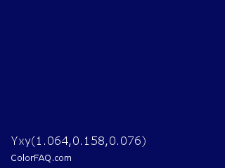 Yxy 1.064,0.158,0.076 Color is a very dark blue color and the nearest color is Gulf Blue #051657. Hex code #060a5e and RGB value is rgb(6,10,94). In RGB color space, this color is composed of 2% red, 4% green, 37% blue, In CMYK color space, this color is composed of 94% cyan, 89% magenta, 0% yellow , 63% black , In HSL color space, this color has a hue angle of 237° , 88% saturation and 20% lightness.