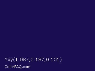 Yxy 1.087,0.187,0.101 Color is a very dark indigo color and the nearest color is Tolopea #1b0245. Hex code #1a0d50 and RGB value is rgb(26,13,80). In RGB color space, this color is composed of 10% red, 5% green, 31% blue, In CMYK color space, this color is composed of 68% cyan, 84% magenta, 0% yellow , 69% black , In HSL color space, this color has a hue angle of 252° , 72% saturation and 18% lightness.
