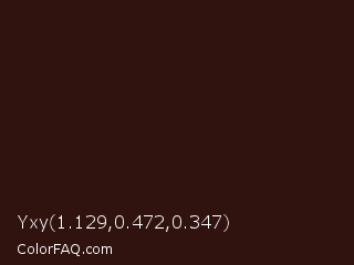 Yxy 1.129,0.472,0.347 Color is a very dark red color and the nearest color is Coffee Bean #2a140e. Hex code #30130f and RGB value is rgb(48,19,15). In RGB color space, this color is composed of 19% red, 7% green, 6% blue, In CMYK color space, this color is composed of 0% cyan, 60% magenta, 69% yellow , 81% black , In HSL color space, this color has a hue angle of 7° , 52% saturation and 12% lightness.