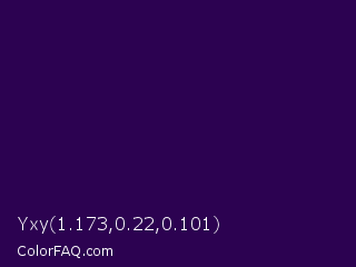 Yxy 1.173,0.22,0.101 Color is a very dark purple color and the nearest color is Cherry Pie #2a0359. Hex code #2c0251 and RGB value is rgb(44,2,81). In RGB color space, this color is composed of 17% red, 1% green, 32% blue, In CMYK color space, this color is composed of 46% cyan, 98% magenta, 0% yellow , 68% black , In HSL color space, this color has a hue angle of 272° , 95% saturation and 16% lightness.