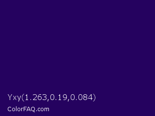 Yxy 1.263,0.19,0.084 Color is a very dark violet color and the nearest color is Cherry Pie #2a0359. Hex code #25025f and RGB value is rgb(37,2,95). In RGB color space, this color is composed of 15% red, 1% green, 37% blue, In CMYK color space, this color is composed of 61% cyan, 98% magenta, 0% yellow , 63% black , In HSL color space, this color has a hue angle of 263° , 96% saturation and 19% lightness.