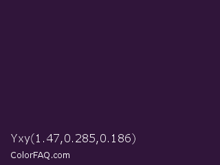 Yxy 1.47,0.285,0.186 Color is a very dark purple color and the nearest color is Dark Purple #301934. Hex code #30153a and RGB value is rgb(48,21,58). In RGB color space, this color is composed of 19% red, 8% green, 23% blue, In CMYK color space, this color is composed of 17% cyan, 64% magenta, 0% yellow , 77% black , In HSL color space, this color has a hue angle of 284° , 47% saturation and 15% lightness.